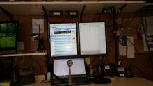 Under the Baofeng, is my 4 port microphone switch.  The Turner Plus Three microphone is sitting on the desk in front of the laptop (its stored up next to the Baofeng when not in use).
